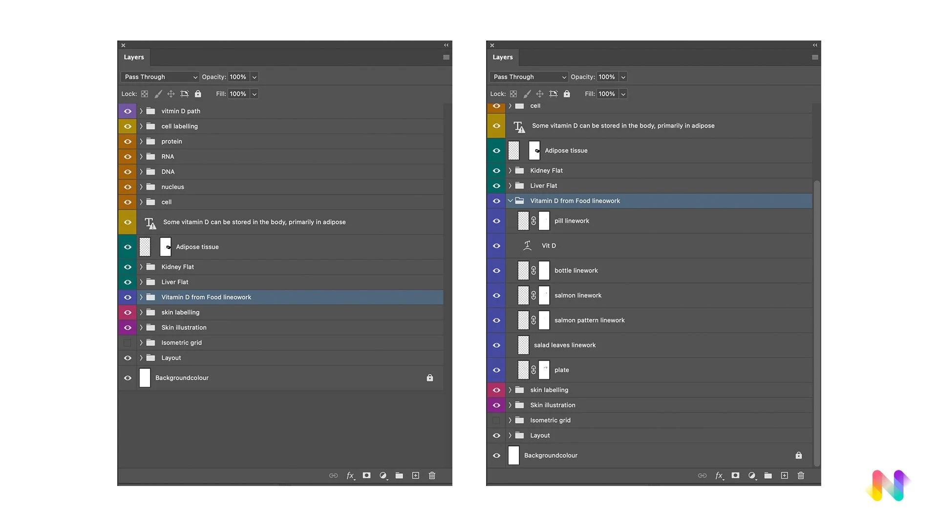 For example, to simplify future edits, each element should be drawn on its own layer and masked out. This means the salmon and the plate, pill bottle and individual pills should each be organised into separate groups. They also have to be well-labelled and grouped properly to make sure colours and shadings can be added easily at the next stage.