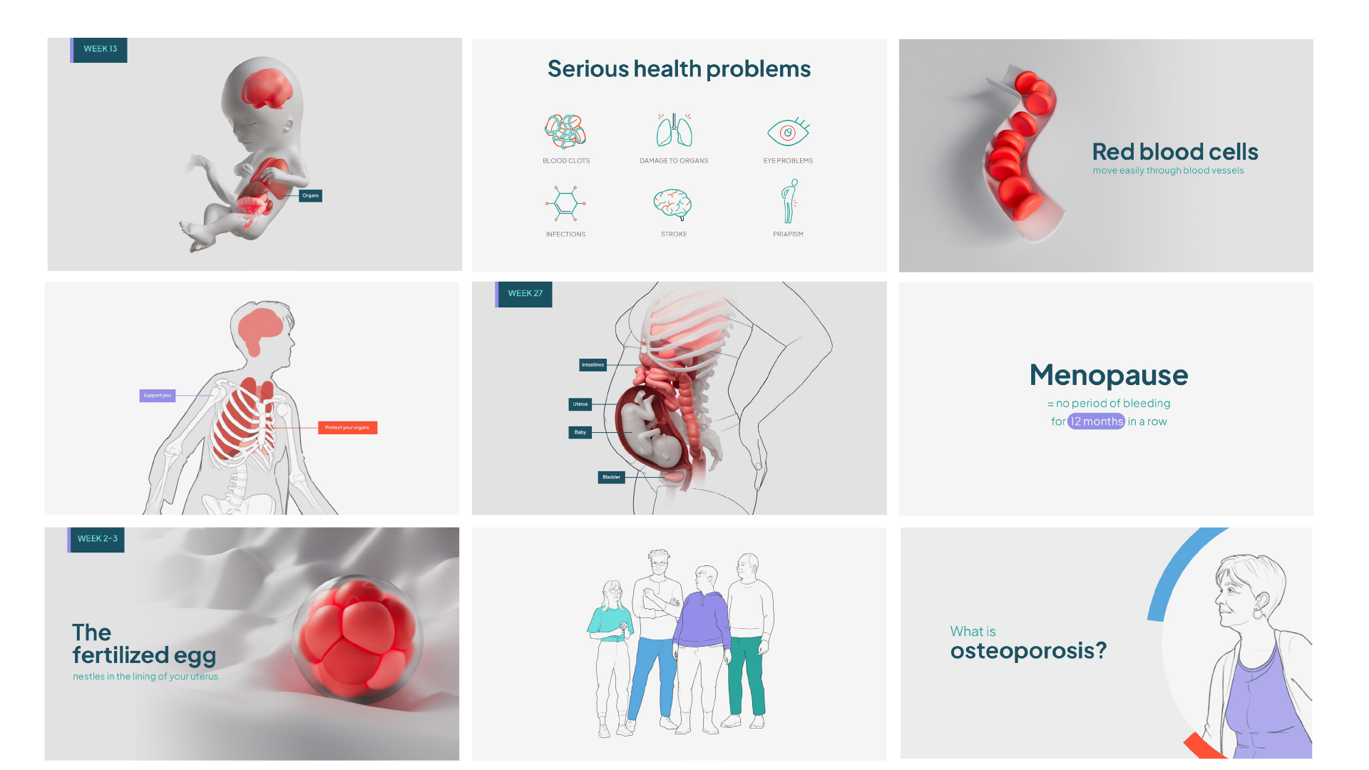 We developed a series of 10 x patient education animations focused on Women's Health across different life stages. Our goal was to create engaging visuals that empowered patients with a clear understanding of their bodies, without overwhelming them with medical jargon.
