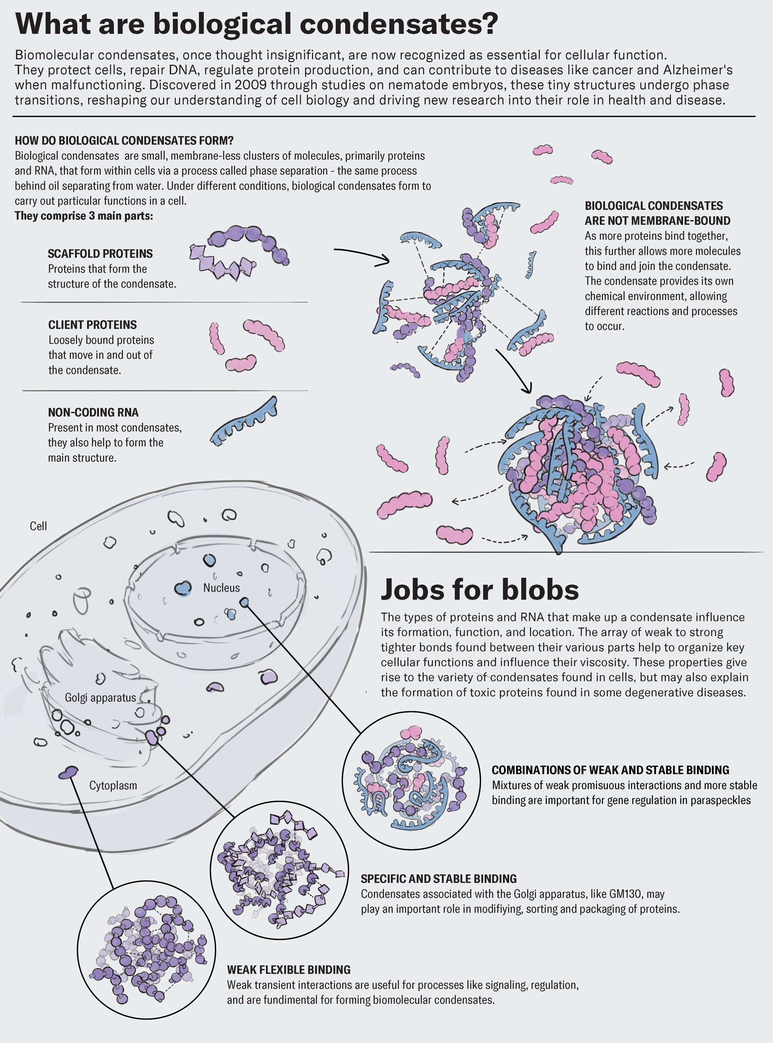 For this Scientific American feature, our team developed a visual editorial layout to accompany an article on biological condensates. Once overlooked, these dynamic cellular structures are now understood to be essential for processes like DNA repair, protein regulation, and cellular protection. Our team created concept sketches, vector illustrations, and a final composition to help illustrate the complex science behind phase transitions and their emerging role in both health and disease, including cancer and Alzheimer’s.